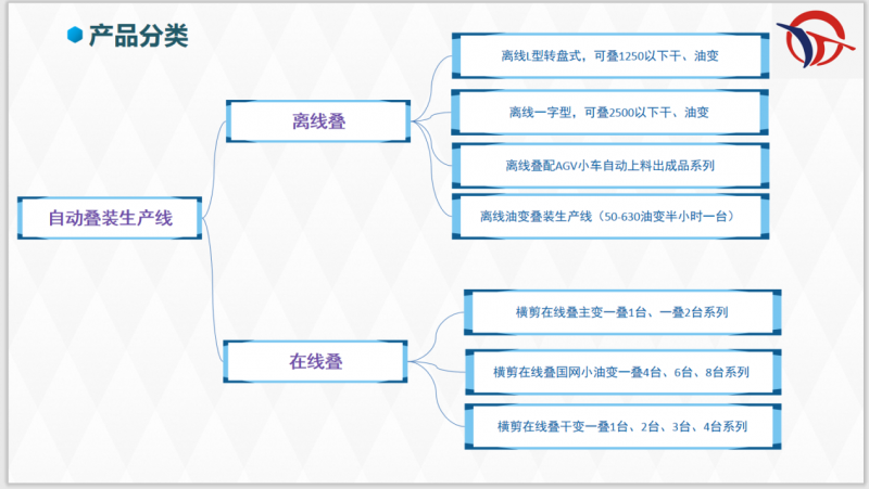 目前我公司的自动叠装生产线包括:横剪在线叠主变一叠1台、一叠2台系列;横剪在线叠国网小油变一叠4台、6台、8台系列;横剪在线叠干变一叠1台、2台、3台、4台系列;离线L型转盘式(可叠干、油变1250以下);离线一字长条型(可叠干、油变2500以下);离线叠配AGV小车自动上料出成品系列;离线油变叠装生产线(50-630油变半小时一台)。欢迎新老客户垂询,我们将竭尽为您服务!