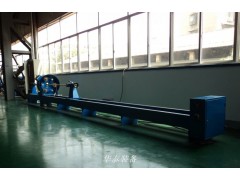 引线水平放置在包扎机头内,用设备两端的支撑架上的三爪卡盘固定夹紧,旋转支撑架后端手轮将引线张紧,包扎机头由传动机构带动可来回往复移动,移动速度可以无极调整,机头可上三盘纸盘,自行旋转并移动将皱纹纸按一定的螺距包扎在线缆上,包扎缠绕速度采用变频调速电机单独无极调速,以便与移动速度配合达到不同缠绕螺距和速度的要求